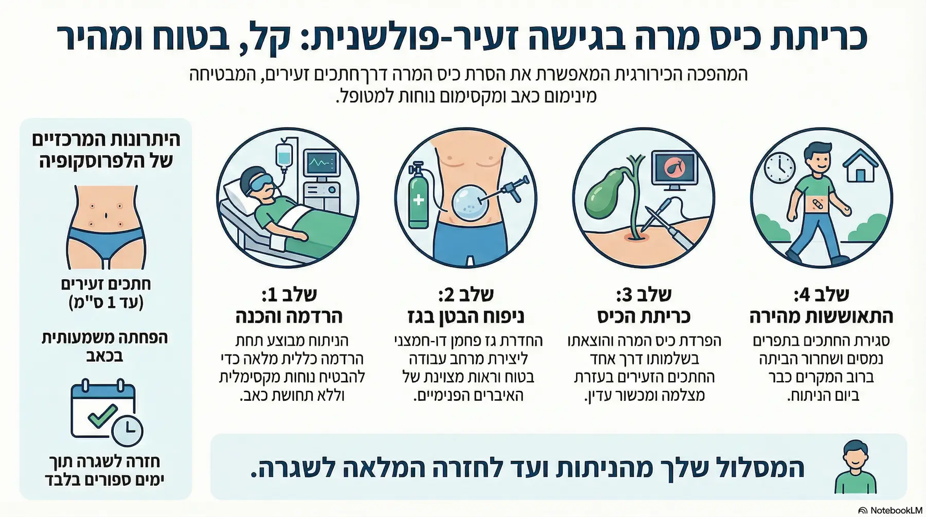 אינפוגרפיקה המציגה את 4 השלבים של כריתת כיס מרה בלפרוסקופיה: הרדמה, ניפוח הבטן, כריתת הכיס והתאוששות מהירה. האיור ממחיש את יתרונות הגישה הזעיר-פולשנית, הכוללים חתכים זעירים והפחתת כאב.