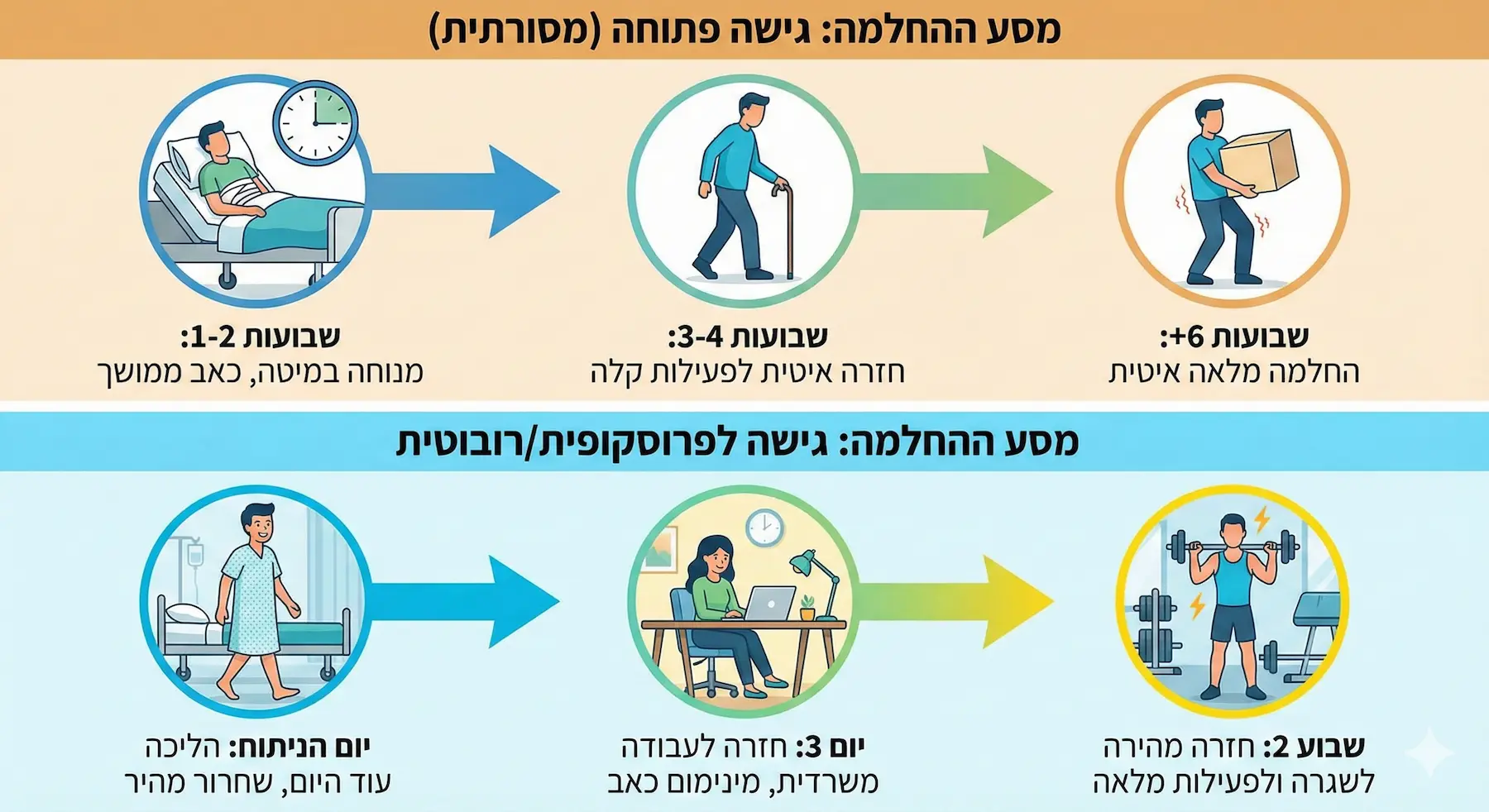 יום הניתוח: מסתיים לרוב בהליכה עצמאית במחלקה. התנועה חשובה למניעת סיבוכים.