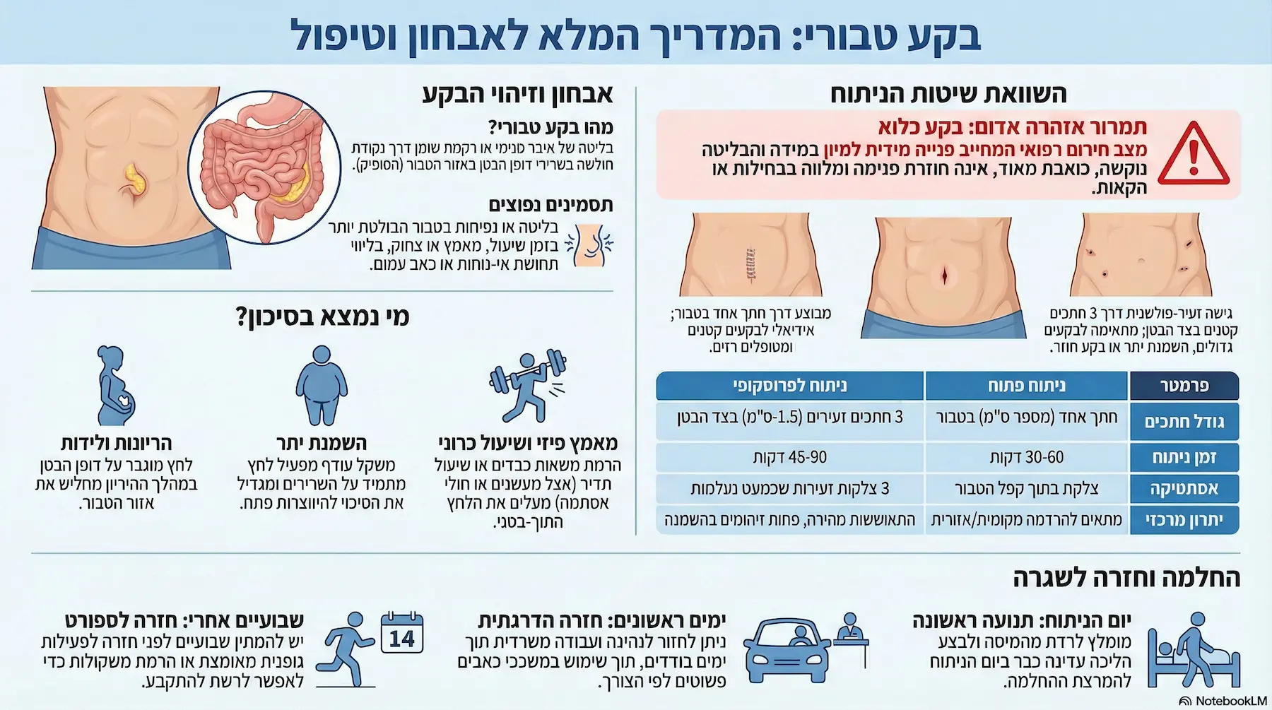 אינפוגרפיקה רפואית מקיפה בנושא בקע טבורי, המציגה את התסמינים, גורמי הסיכון (הריון, השמנה ומאמץ פיזי), השוואה מפורטת בין ניתוח פתוח ללפרוסקופי, והנחיות לשלבי ההחלמה והחזרה לשגרה.